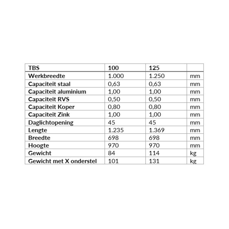 - Kapazität: 1000 x 0,63 mm Stahl 400N/mm2, 0,8 mm Kupfer und Zink; 1 mm Aluminium
