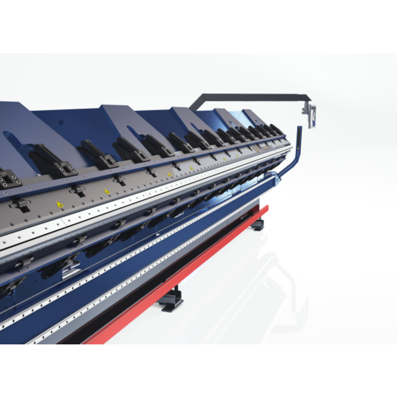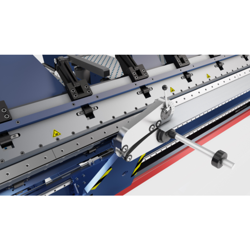 - Der elektrische Hinteranschlag mit einer Arbeitstiefe von 5 - 1000 oder 5 - 1250 mm wird über Präzisions-Kugelumlaufspindeln angetrieben. Das konische Biegen von Profilen ist bei der Doppelbiegemaschine Standard. Optional ist ein Hinteranschlag mit vollautomatischen Greifern erhältlich. Bürstentische sorgen für kratzfreies Materialhandling