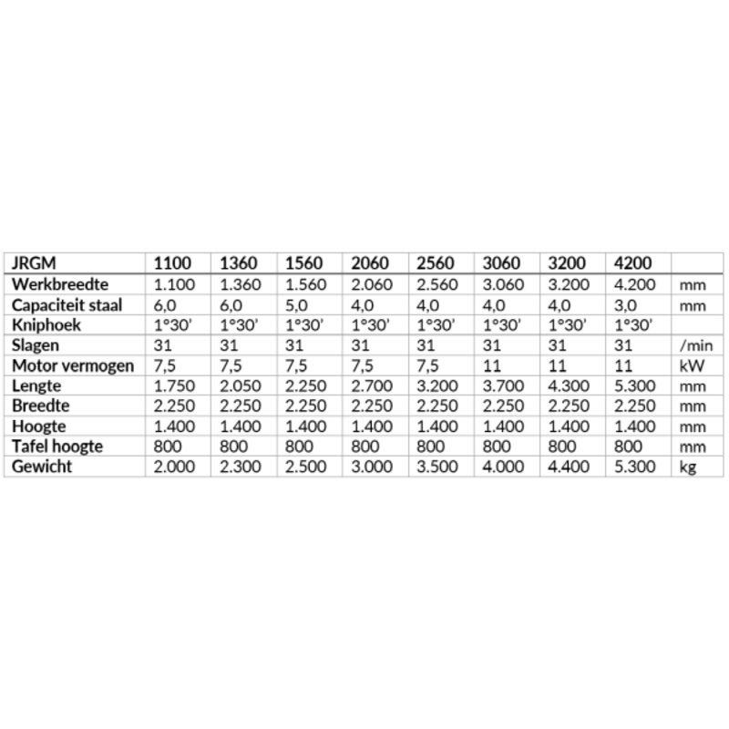 The JÖRG Guillotine Shears JRGM 3200 are heavy, electric gear-driven plate shears. These are plate shears with a simple and robust construction. The blades have an adjustable cutting clearance, making these shears great for cutting different sheet thicknesses.