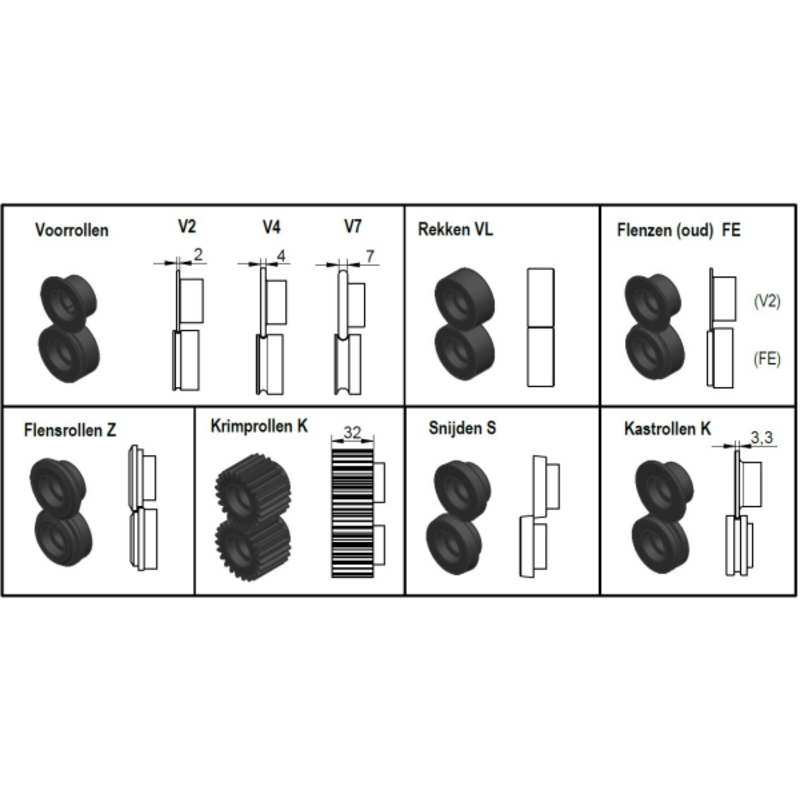 The rolls are interchangeble with other swaging machines from JÖRG, types 5300, 5301, 5302, 5305 and 4301. In addition to the standard rollers, various special rollers are available.