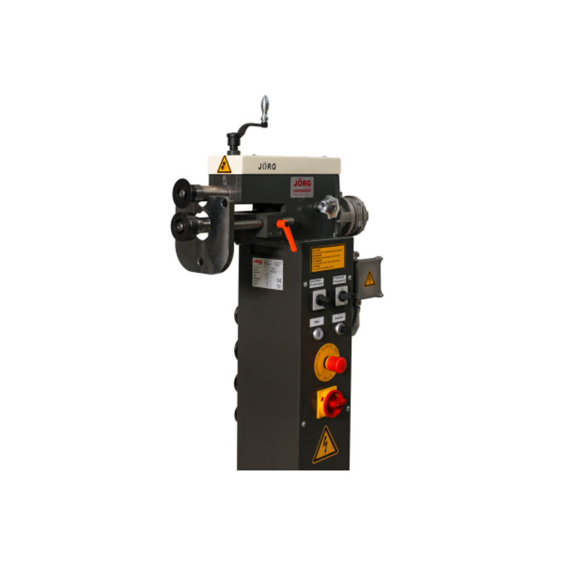 The JÖRG Swaging Machine 5343-V is manufactured with a strong, welded construction, where all rotating parts are carefully crafted. This results in a particularly stable and reliable machine. Both shafts are driven by a 1.1 kW AC motor. The machine is equipped with a double foot pedal, an adjustable gauge, a hardened front plate, and comes with 5 sets of rolls. The top roll can be axially adjusted with a rack, and the height of the top roll can be adjusted with a spindle. Thanks to the frequency control, the machine has an adjustable Softstart and Quickstop. The discharge is adjustable, making this machine very suitable for swaging flat plates. The machine is standardly delivered with 10 rolls and is equipped with: