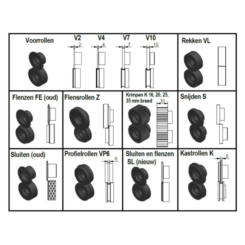 - Standard with 10 rolls, including rollers 1-2, 3-4, 5-6, 9-7, and 8-8