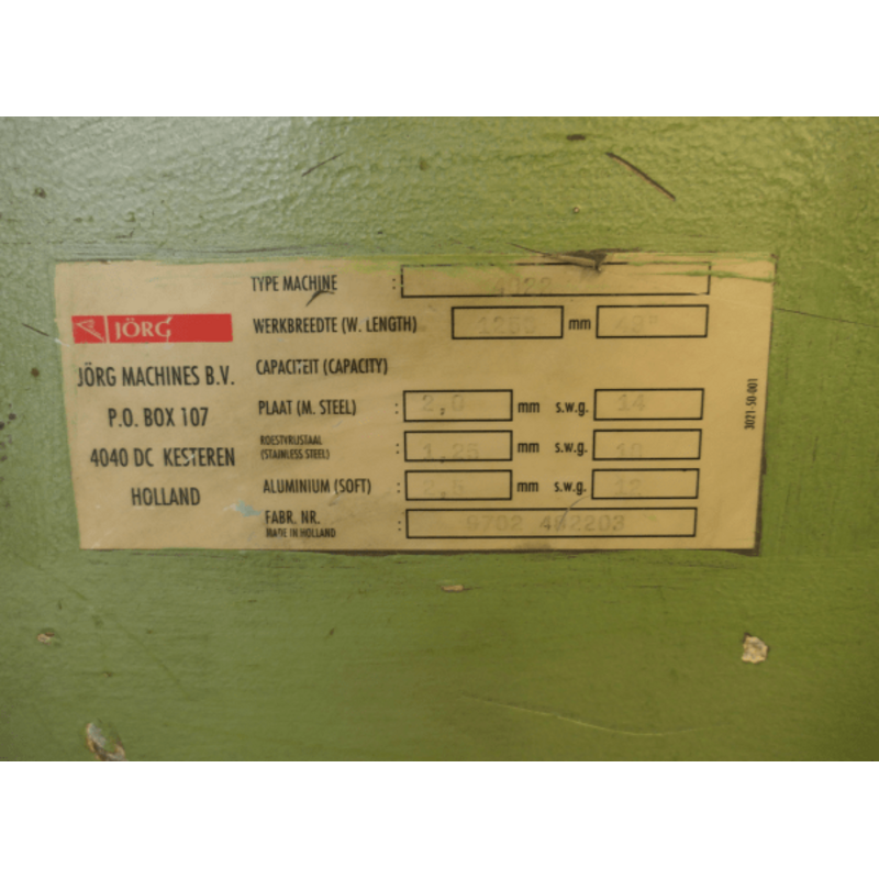 The M1456 JÖRG Guillotine Shear 4022 Used is a motor-driven plate shear. The shear has a working width of 1250 mm and a capacity of 2 mm.