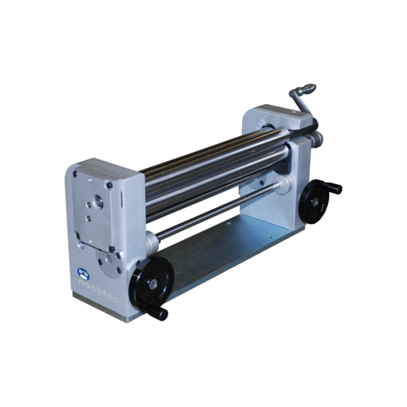 The NOSSTEC Bending Roll Machine 4126 is a small, manually operated precision roller with rolls ranging from 25 to 40 mm in diameter. The rolls are not crowned. The side frames of the roller are made of anodized, high-strength aluminium. The lower and bending rolls are adjusted using handwheels. The top roll can be easily swung out to remove rolled products. The bending roll can be tilted for cone bending.
